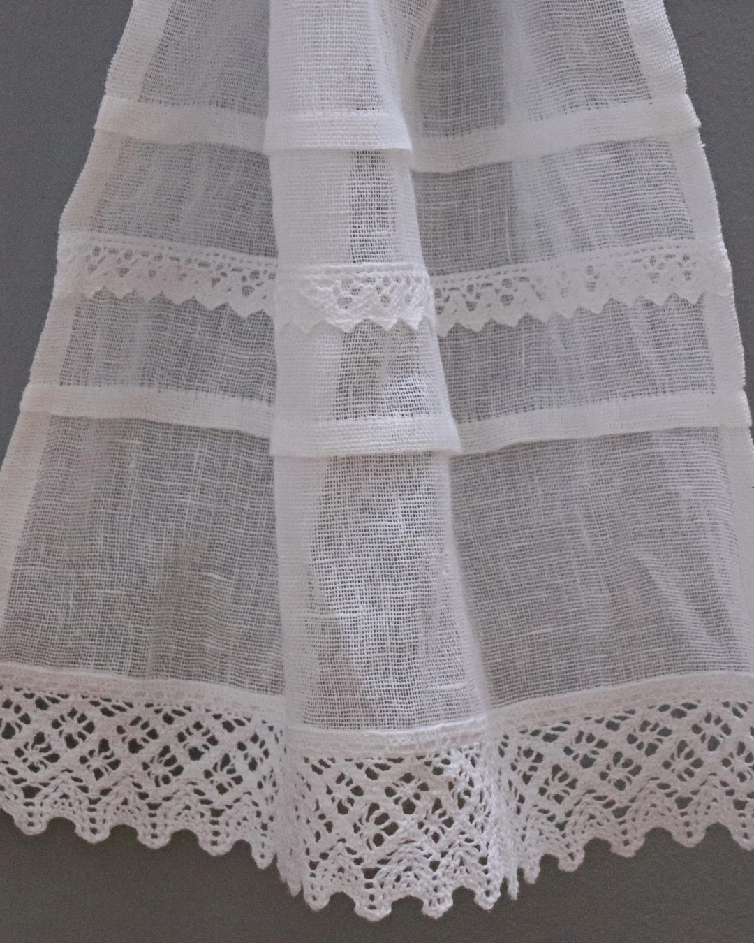 Transparentny len z koronkami subtelnie rozprasza światło, wprowadzając do wnętrza lekkość i spokój. Z bliska widoczny jest rzemieślniczy charakter detali, który dobrze odnajduje się w aranżacjach rustykalnych i vintage.
