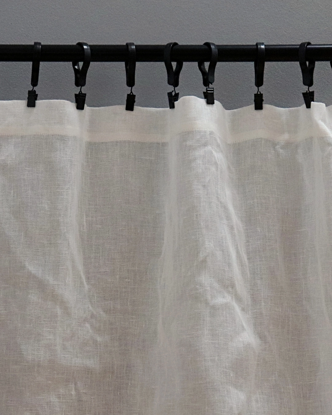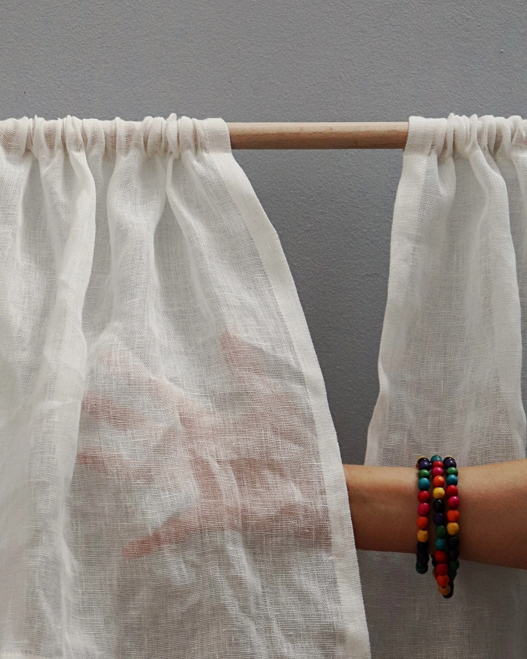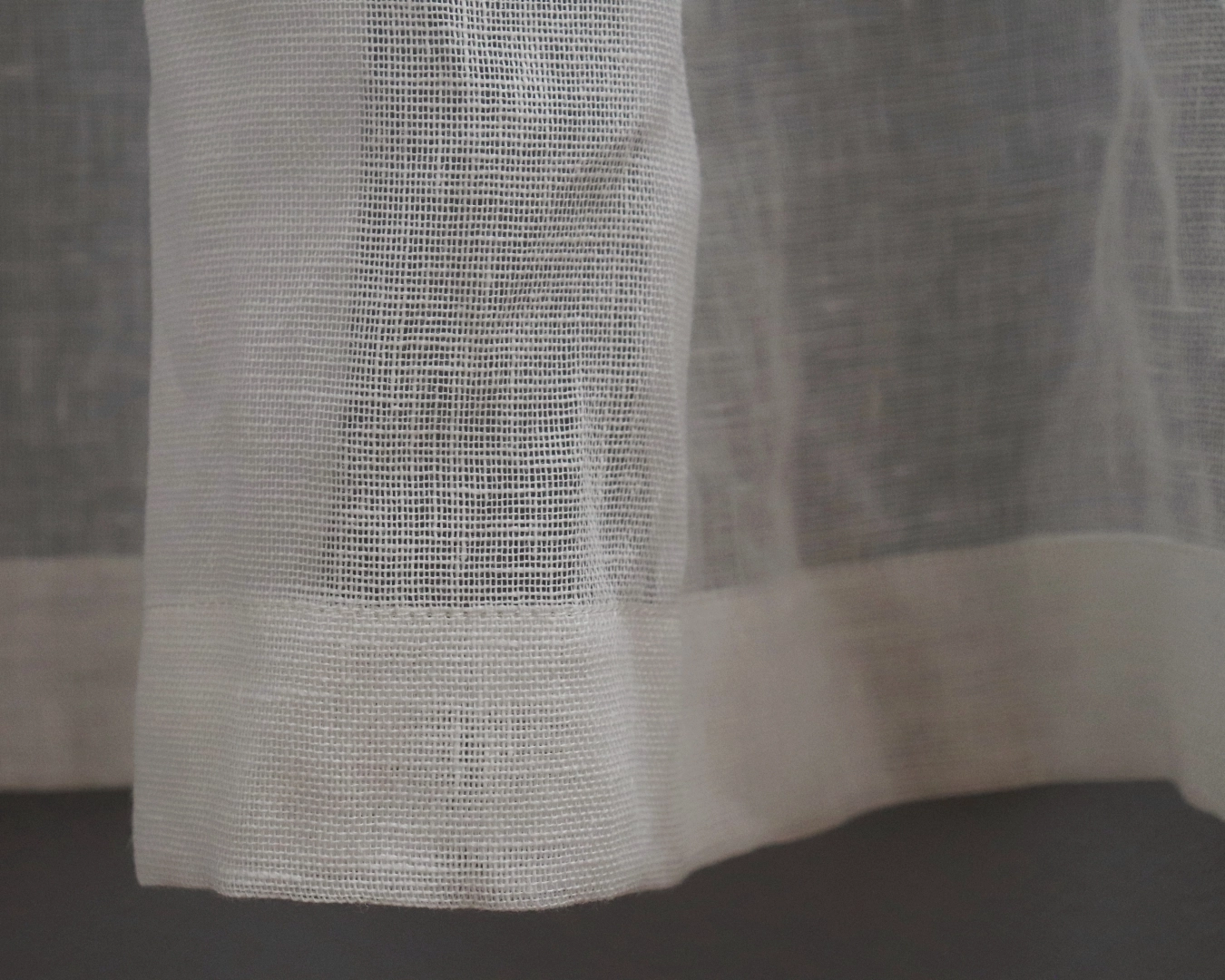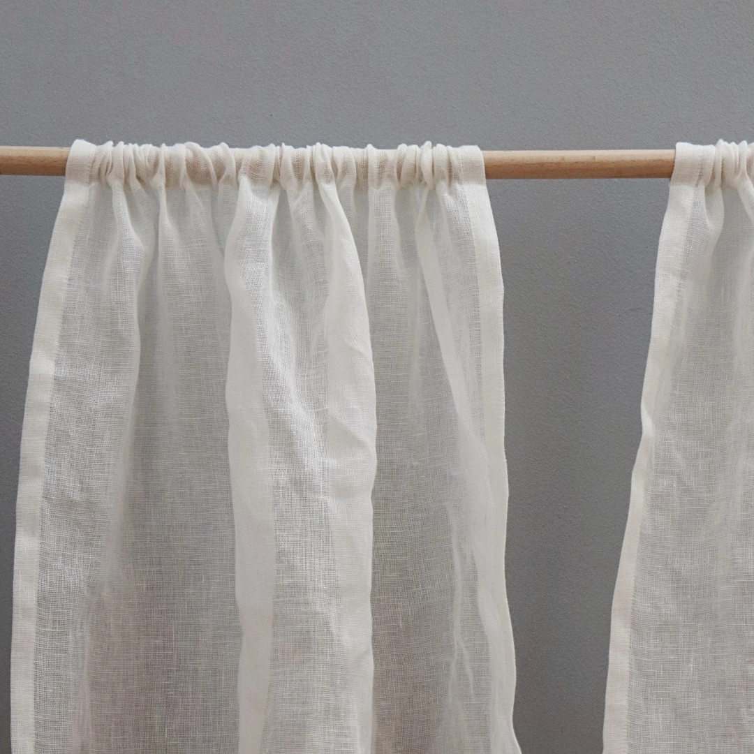 Lniany muślin delikatnie rozprasza światło, dzięki czemu wnętrze pozostaje jasne, a jednocześnie bardziej miękkie i ciepłe. Tkanina naturalnie się układa i nie wymaga prasowania — subtelne zagniecenia są jej cechą i częścią estetyki. Len został wcześniej wyprany, dzięki czemu firana nie kurczy się i zachowuje swój wymiar.