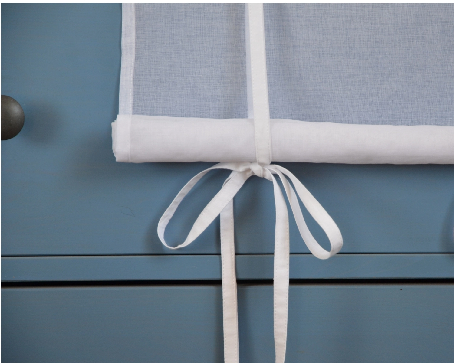Roleta zwijana jest w równy rulon podtrzymywany tasiemkami. Batystowe tasiemki są miękkie i lekkie, dzięki czemu łatwo układają się w estetyczne kokardki. Fiszbiny wzmacniają konstrukcję i pomagają zachować równą formę po zwinięciu.
