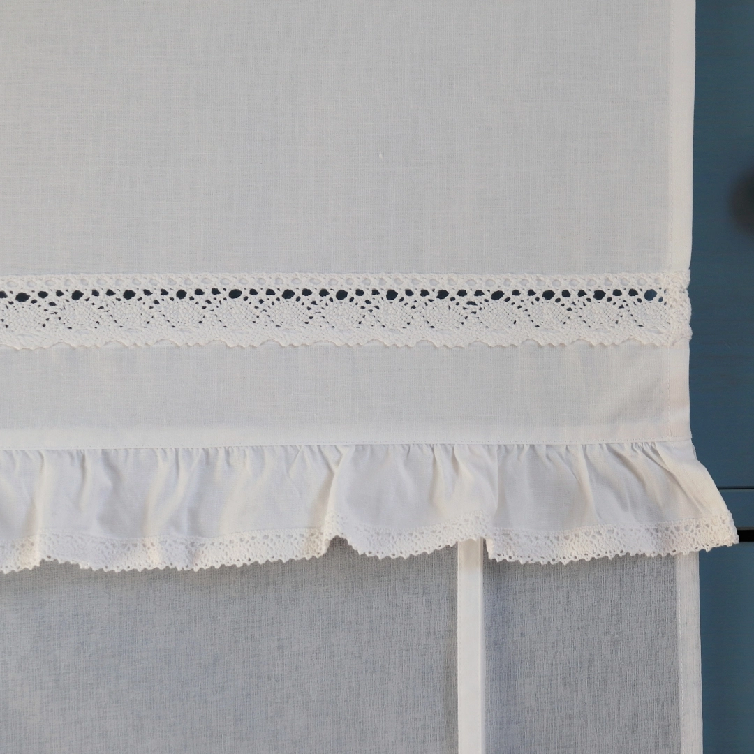 Roleta ELVA to dekoracyjna roleta firanowa szyta z bawełny, woalu i batystu. Transparentna koronka delikatnie rozświetla tkaninę, a falbanka wykończona bawełnianą koronką oraz batystowe tasiemki i kokardki nadają całości romantyczny, lekko boho charakter.