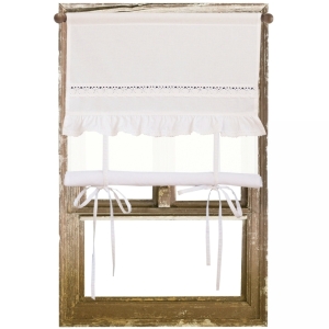 Dolna część z woalu delikatnie filtruje światło, rozjaśnia wnętrze i nadaje całości lekkości. Falbanka wykończona bawełnianą koronką oraz miękkie batystowe kokardki podkreślają romantyczny charakter modelu. ELVA jest subtelnie bardziej dekoracyjna niż LUNA i dobrze odnajduje się we wnętrzach romantycznych, shabby chic, rustykalnych i delikatnie boho.