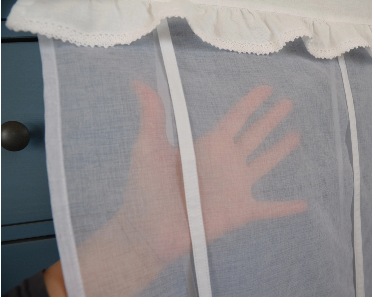 Transparentna część delikatnie filtruje światło i pomaga stworzyć jasne, miękkie wnętrze. Model ma spokojny, harmonijny charakter — ozdobą pozostaje falbanka wykończona subtelną bawełnianą koronką oraz miękkie kokardki z batystu.